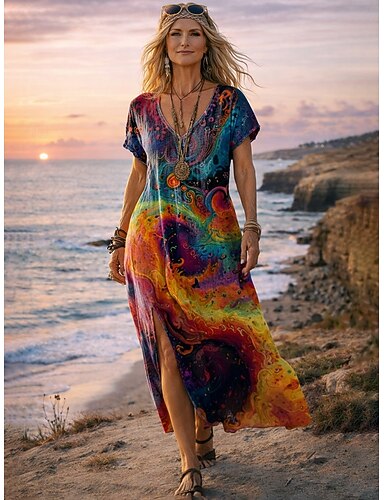 Per donna Abito maxi Abito Boho Vestito Casual Abito a trapezio Abito Stampato Vintage All'aperto Vacanza Weekend Vestibilità comoda Grafico Paisley Manica Corta Scollo a V Arcobaleno Estate Primavera