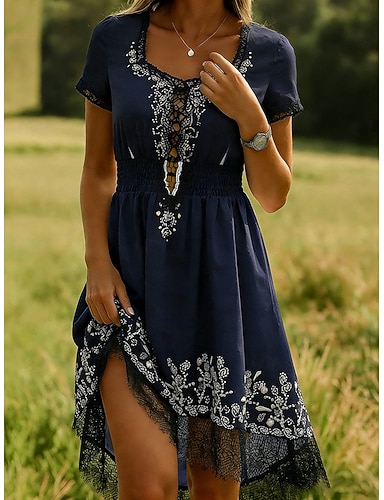 Per donna Mini Abito Abito in Pizzo Abito Floreale Elegante Moda Moderno Quotidiano All'aperto Vacanza Vestibilità regolare Floreale Manica Corta Scollo a V Nero Blu marino Estate Primavera