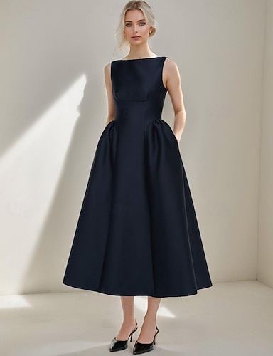 Linea ad A Lunghezza Tè Abiti da Cocktail Abiti da festa Elegante Senza Maniche Scollo a Barca Festa in giardino Matrimonio Raso con Pieghe Tasca