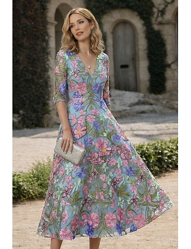 Linea ad A Lunghezza Tè Abiti da Cocktail Elegante Vintage Floreale Mezza Manica Bavero Festa in giardino Matrimonio Tasca Raso Shiena scoperta con Fiore ricamato Ricamo Tasca