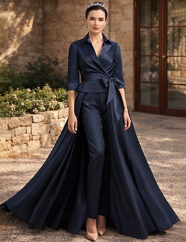 Due Pezzi Tuta Completo Pantalone Lunghezza alla caviglia Abito da cerimonia per signora Mezza Manica Colletto a Camicia Elegante Formale Ospite di nozze Raso con Fiocco/Fiocchi