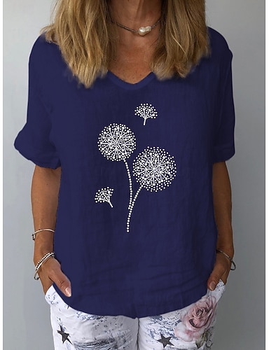 Per donna Maglietta Finto cotone e lino Stampato Grafico Dente di leone Moda Elegante Classico Manica Corta Scollo a V Top Regolari Quotidiano Uscire Weekend Bianco Giallo Blu inchiostro Grigio
