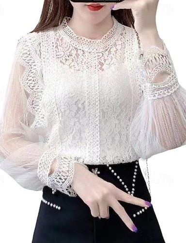 Per donna Camicia di Pizzo Blusa Top traforato Camicia in Pizzo Bianco Pizzo Tinta unita Elegante Moda Essenziale Scollo a V Quotidiano Bianco Primavera Autunno Inverno Autunno & Inverno