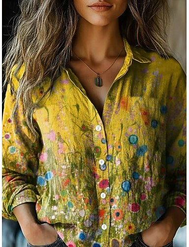 Per donna Camicia Finto cotone e lino Bottoni Stampato Floreale Grafico Bohemien Attivo Casual Manica Lunga Colletto a Camicia Top Regolari Quotidiano Ferie Giallo Primavera Autunno