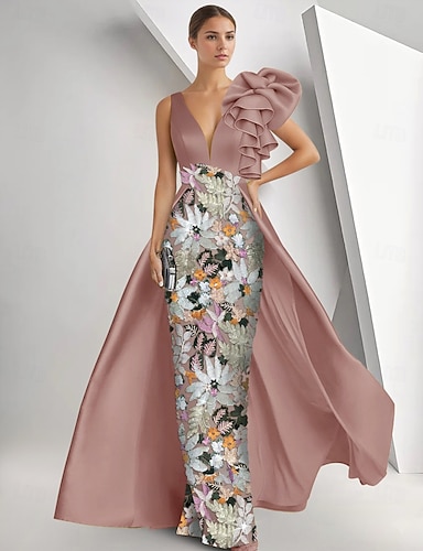 Tubino Colonna Lunghezza al pavimento Perline ricamate Abito Formale Abito da madre della sposa Abito da Sera Abito formale Elegante Brillanti Setoso Senza Maniche Scollo a V Matrimonio Formale