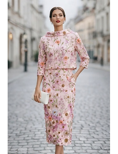 Vestito da festa a lunghezza tè in stile tubino colonna abito da cocktail abito per invitata a matrimonio abito per madre della sposa maniche 3/4 scollo rotondo elegante vintage semplice invitata a