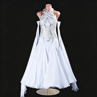 Abito da ballo da competizione bianco da donna, gonna ampia con strass, abito da ballo liscio con maniche fluttuanti