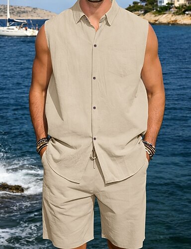 Da uomo Camicia di lino Set Camicia Camicia casual E Impostare Semplice Casuale Quotidiano Spiaggia Collo ripiegato Senza Maniche Estate Primavera Moda Casual Confortevole Abbigliamento