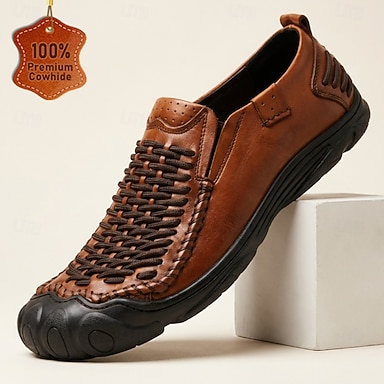 Mocassini casual da uomo in pelle di alta qualità, marroni, intrecciati e traspiranti, ideali per vacanze al mare, attività all'aperto e viaggi.