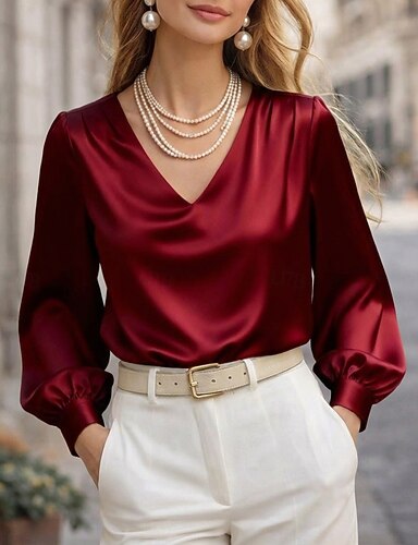 Per donna Camicia Top in raso Blusa A calotta di seta Arricciato Semplice Elegante Essenziale Casual Manica Lunga Scollo a V Top Regolari Quotidiano Ferie Uscire Nero Bianco Rosso Albicocca Primavera
