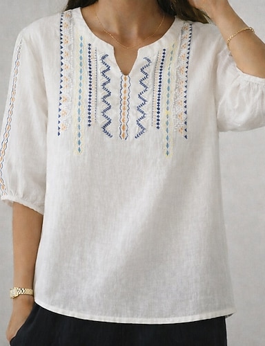 T-shirt boho da donna in cotone 100% camicia in lino T-shirt ricamata T-shirt vintage stilosa etnica a maniche mezze maniche a lanterna V collo tops regolari quotidiane per uscire Bianco Rosso Verde