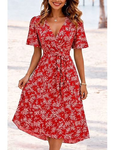 Per donna Abito Midi Abito a trapezio Vestito a fascia Abito con balze Vacanza Casual Ferie Data Vestibilità regolare Floreale Grafico Manica Corta Scollo a V Blu Rosso Viola Verde Estate Primavera