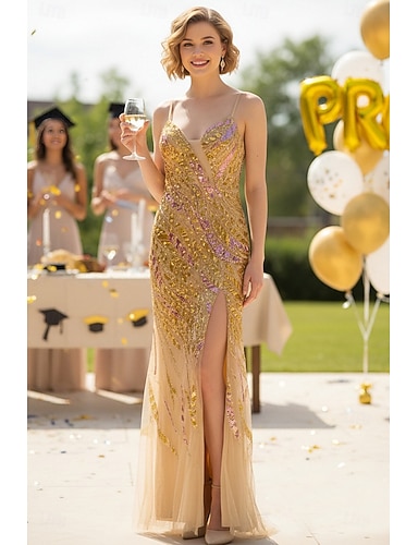 Tubino Colonna Strascico a Terra Asimmetrico Abito da Ballo Perline ricamate Abito Formale Abiti da Ballo Elegante Festa Scintillante Senza Maniche Spalline sottili Balli di fine anno Matrimonio con