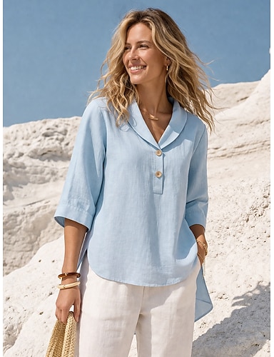 Per donna Camicia Camicia in cotone e lino Maglia Henley Finto cotone e lino Bottoni Semplice Quotidiano Elegante Casual Manica Lunga Scollo a V Top Regolari Quotidiano Lavoro Ferie Blu Bianco Beige