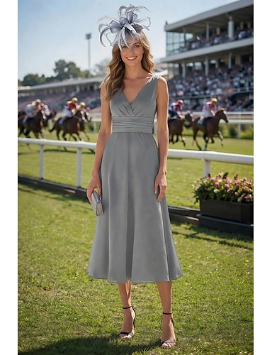 Linea ad A Lunghezza Tè Vestito da Festa Abito da Cocktail Abito da invitata a nozze Abito da cerimonia per signora Manica Corta Scollo a V Elegante Semplice Raso con Tinta unita