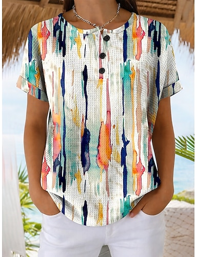 Maglietta Waffle da donna stampa grafiche a righe astratte vintage elegante classica manica corta girocollo standard quotidiana blu rosa arancione verde estate primavera