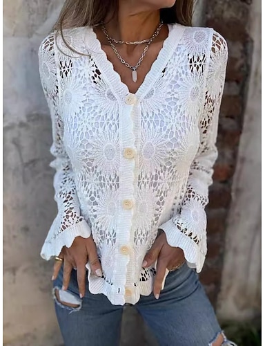 Per donna Camicia Pizzo Tinta unica Elegante Essenziale Casual Manica Lunga Scollo a V Top Regolari Quotidiano Uscire Bianco Primavera Autunno