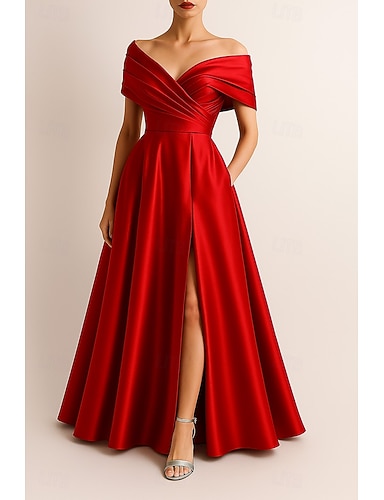 Linea ad A Lunghezza al pavimento Abito da Sera Da principessa Abito formale Elegante Vintage Setoso Manica 3/4 Senza Spalle Matrimonio Formale Tasca Raso con Fiocco/Fiocchi
