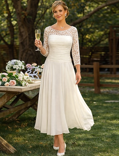 Linea ad A Lunghezza alla caviglia Vestito da Festa Abito da Cocktail Abito da invitata a nozze Abito da cerimonia per signora Manica 3/4 Collo gioiello Elegante Ospite di nozze Chiffon Pizzo con