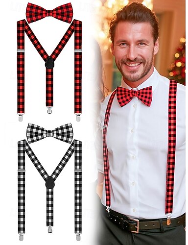 Set da uomo con bretelle e papillon regolabili a quadri natalizi, stile casual e formale, perfetto per feste e regali