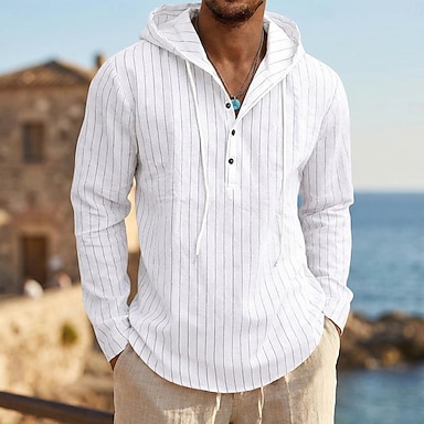 Per uomo Camicia Camicia di lino Camicia Estiva Abbigliamento da spiaggia Camicia con cappuccio Camicie a righe Strisce verticali Casuale Vacanza Nero Bianco Blu marino Verde Manica Lunga Felpa con