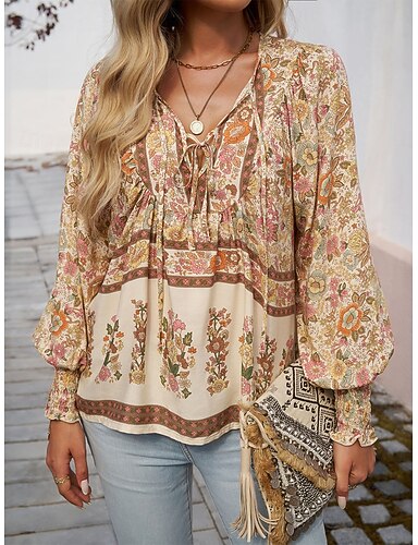 Per donna Camicia Blusa Patchwork Stampato Floreale Grafico Bohemien Vacanza Vintage Manica Lunga Scollo a V Top Regolari Quotidiano Ferie Uscire Blu Giallo Rosa Arancione Blu scuro Primavera Autunno