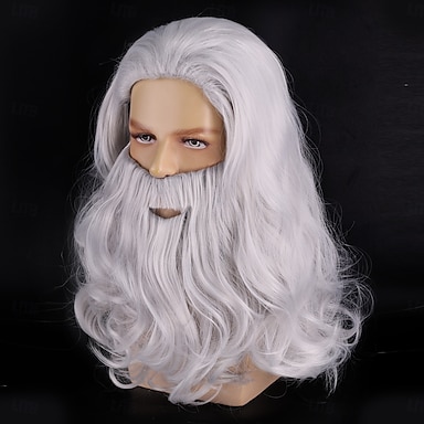 Parrucca e barba bianca lunga e riccia da uomo, set da vecchio, costume da mago di Babbo Natale, accessorio per feste in cosplay