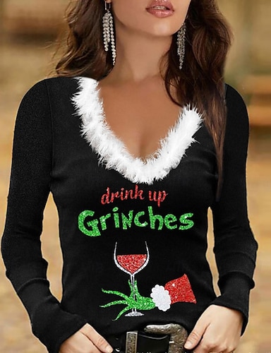 T-Shirt da Donna Natale Manica Lunga Festiva Collo a V Collo Peluche Top Casual per Feste Invernali Stampa Nera