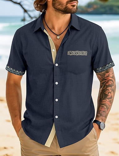 Per uomo Geometrico Camicia di lino Camicia Estiva Camicia da Spiaggia Manica Corta Moda Casual Vacanza Ferie Abbigliamento mare Estate Primavera Collo ripiegato camicie con colletto Una tasca