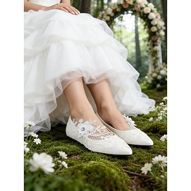 ballerine da sposa in pizzo bianco con punta a punta, rete effetto illusione e applicazioni floreali: eleganti scarpe da sposa per cerimonia e ricevimento in giardino