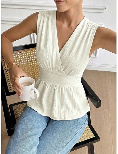 Per donna Canotta Arricciato Semplice Elegante Moda Classico Senza Maniche Manica Corta Scollo a V Top Regolari Quotidiano Uscire Weekend Albicocca Estate Primavera