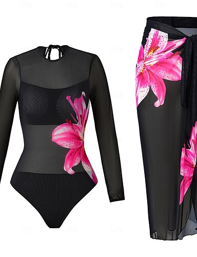Costume da bagno intero da donna snellente con gonna monokini gonna in rete controllo della pancia vita alta slanciato elegante abbigliamento da spiaggia per le vacanze floreale collo rotondo maniche