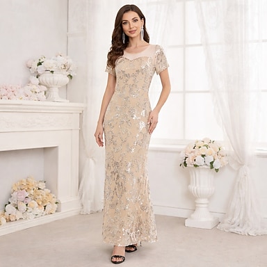 Sirena Tromba Lunghezza al pavimento Abito da Sera Elegante Brillare & Splendere Manica Lunga Scollo Illusione Carnevale Mascherata Abito Champagne per la Madre della Sposa Raso Con Paillettes con