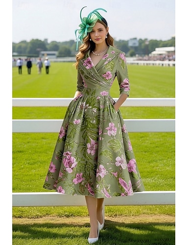 Linea ad A Lunghezza Tè Vestito da Festa Abito da Cocktail Abito da invitata a nozze Abito da Sera Elegante Vintage Manica 3/4 Colletto a Camicia Matrimonio Formale Jacquard con Tasca