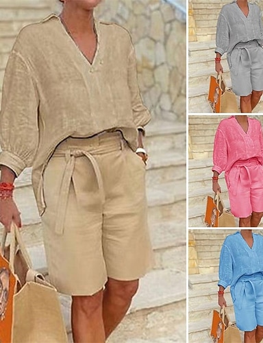 Per donna Camicia Set di biancheria in cotone Set da due pezzi Shorts da Spiaggia Manica Corta Scollo a V Tinta unica Coulisse Moda Streetwear Abbigliamento quotidiano Data Blu Cachi Grigio Estate