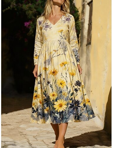 Per donna Abito Midi Abito Boho Vestito Casual Elegante Vintage Quotidiano All'aperto Vacanza Vestibilità regolare Floreale Manica Lunga Scollo a V Giallo Estate Primavera Autunno