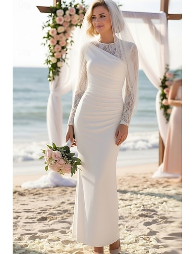 Tubino Colonna Lunghezza al pavimento Abito Bianco Piccolo vestito bianco Elegante Piccoli Abiti Bianchi Manica Lunga Girocollo Matrimonio Formale Shiena scoperta con Pizzo Arricciato