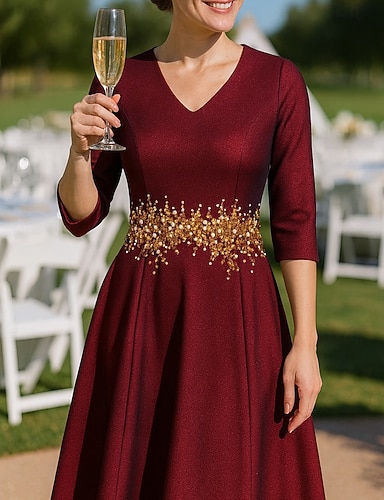 Abito da prom a lunghezza ginocchio A-Line Abito da festa Abito da sera Abito per la madre della sposa Manica a 3/4 Collo a V Elegante Vintage Festa con Perline