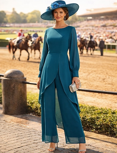 Completo Pantalone Asimmetrico Abito da cerimonia per signora Manica Lunga Girocollo Elegante Formale Ospite di nozze Serata Formale Chiffon con Tinta unita