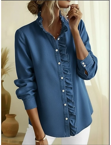 Per donna Blusa Volant Bottoni Tinta unica Elegante Essenziale Casual Manica Lunga Scollo a V Top Regolari Quotidiano Blu Nero Rosso Cachi Primavera Autunno
