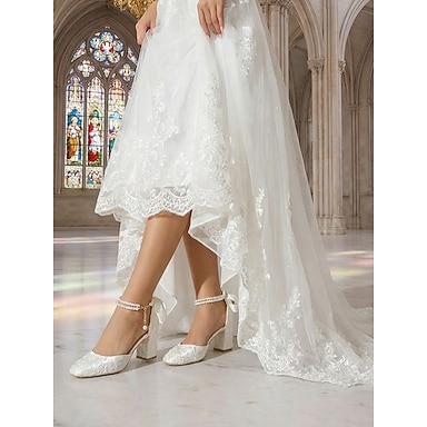 scarpe da sposa da donna con tacco a blocco in pizzo color avorio: elegante stile da sposa per matrimoni in chiesa