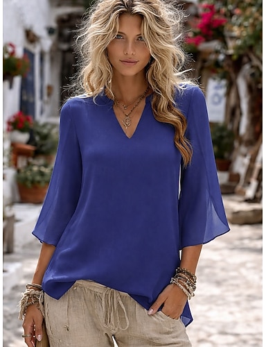 Per donna Blusa Tinta unica Elegante Casual Manica 3/4 Scollo a V Top Regolari Quotidiano Rosa Vino Rosso Blu Reale Verde Estate Primavera