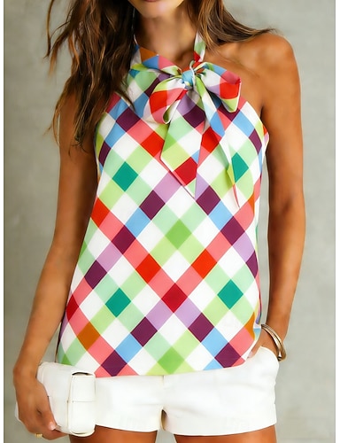 Per donna Top in raso Top con scollo all'americana Canotta Maglietta senza maniche Nodo da legare Grafico Plaid Moda Classico Casual Senza Maniche Top con spalle scoperte Top Regolari Quotidiano
