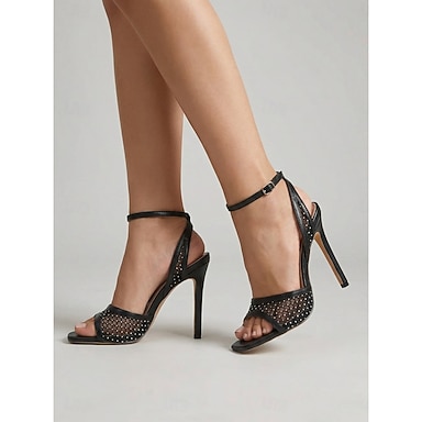 Eleganti sandali da donna neri in rete con tacco a spillo e strass scintillanti. &cinturino alla caviglia per vacanze tropicali, serate estive &glamour quotidiano