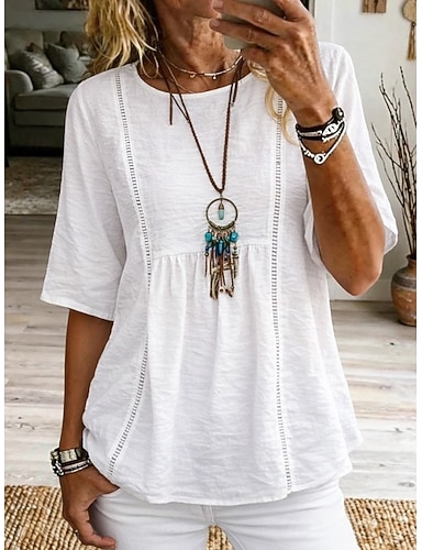 Per donna Blusa Finto cotone e lino Tinta unica Quotidiano Elegante Essenziale Mezza Manica Girocollo Top Regolari Quotidiano Blu Bianco Estate Primavera Autunno