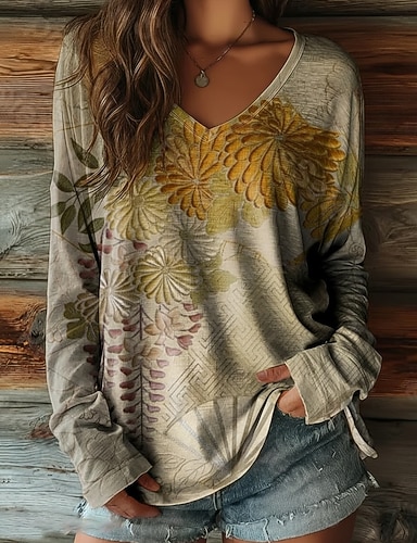 Per donna Maglietta Stampato Floreale Grafico Vintage Classico Casual Manica Lunga Scollo a V Top Regolari Quotidiano Blu Viola Verde Primavera Autunno
