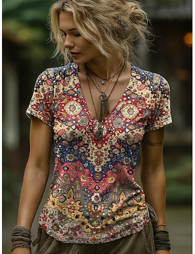 Per donna Maglietta Stampato Grafico Paisley Astratto Bohemien Vintage Elegante Manica Corta Scollo a V Top Regolari Quotidiano Uscire Weekend Arancione Estate Primavera