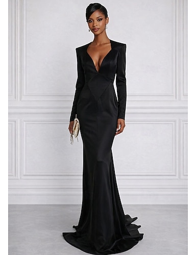Sirena Tromba Strascico a Terra Abito da Sera Elegante Stile Celebrità Manica Lunga Scollo a V Festa in giardino Matrimonio Raso con Tinta unita