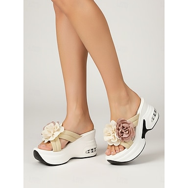 Sandali con zeppa da donna gialli a fantasia floreale, ciabatte con plateau decorate con fiori 3D, comode scarpe casual a punta aperta per l'estate, la spiaggia e l'uso quotidiano. &gite in giardino