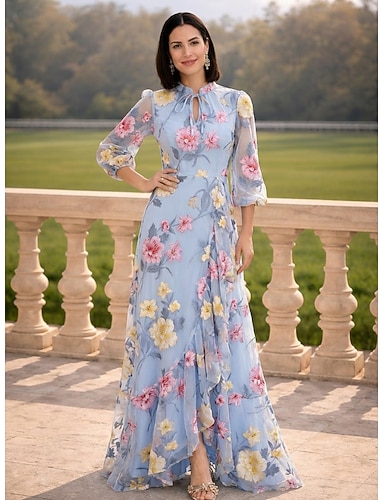 Linea ad A Lunghezza al pavimento Vestito da Festa Abito da Cocktail Abito da Sera Elegante Vintage Floreale Manica Lunga Collo Alto Formale Ospite di nozze Chiffon con Volant